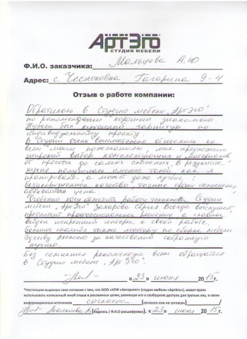 *От компании: Спасибо за отличный отзыв. Такие отзывы как Ваш, лучшая награда и стимул для развития, на радость нашим клиентам. Будем рады видеть Вас снова в нашей Студии мебели "АртЭго".