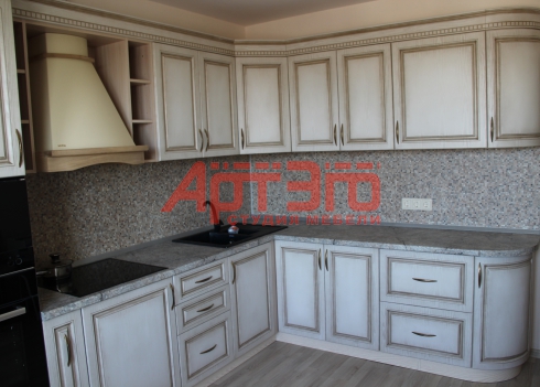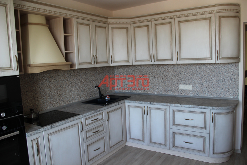 Фасад МДФ пленка ПВХ, цвет "Белое дерево в патине", фрезеровка "Милан". Радиусный фасад создает удобство в эксплуатации кухни. Модель укомплектована встраиваемой техникой BOSCH. Влагостойкая столешница пластик 38мм(СКИФ). Ручки бронза. Металлическая фурнитура BOYARD.