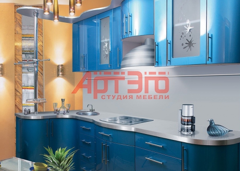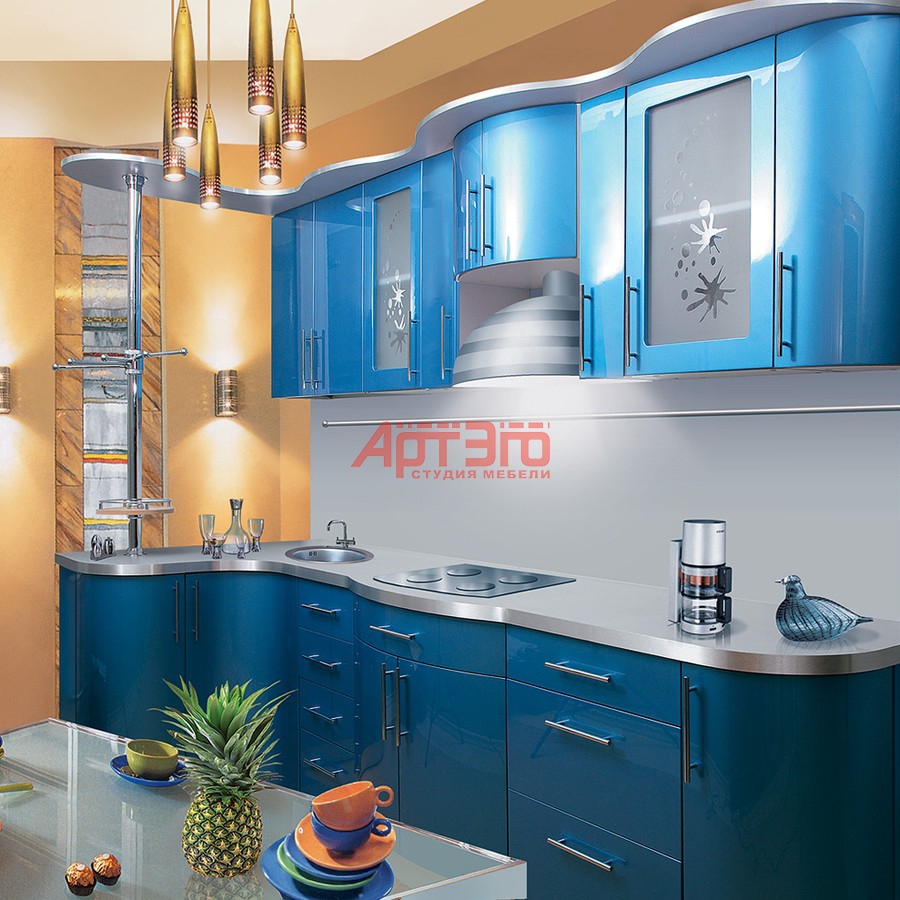 Стильный кухонный гарнитур для поклонников плавных переходов, без острых углов. Уютная кухня с фасадом из крашенного МДФ бирюзового цвета с эфффектом металлик - как частичка моря у вас на кухне. Радиусные элементы создают атмосферу уюта - мебель несмотря на высокие верхние шкафы мебель выглядит воздушно и не нагружает пространство. Матовое стекло в витринных фасадах придает дополнительную легкость.