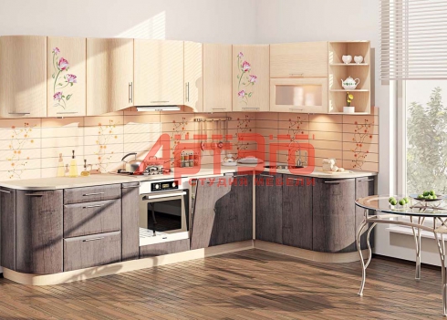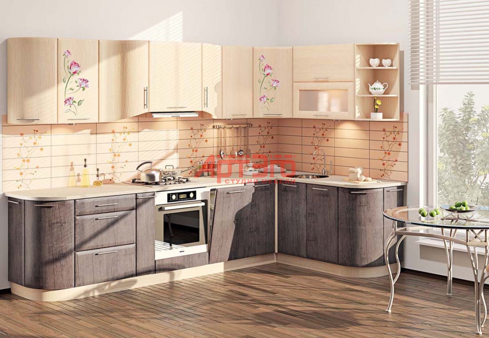 Фасад кухонного гарнитура выполнен из МДФ в пленке ПВХ, с комбинацией 2-х цветов светлого верха и темного низа, Закругленные фасады обеспечивают дополнительное удобство и придают гарнитуру "законченный" вид. Модель оборудована встроенной техникой. Фурнитура : металлические ручки релинги, петли с доводчиками, направляющие полного выдвижения производство BOYARD.