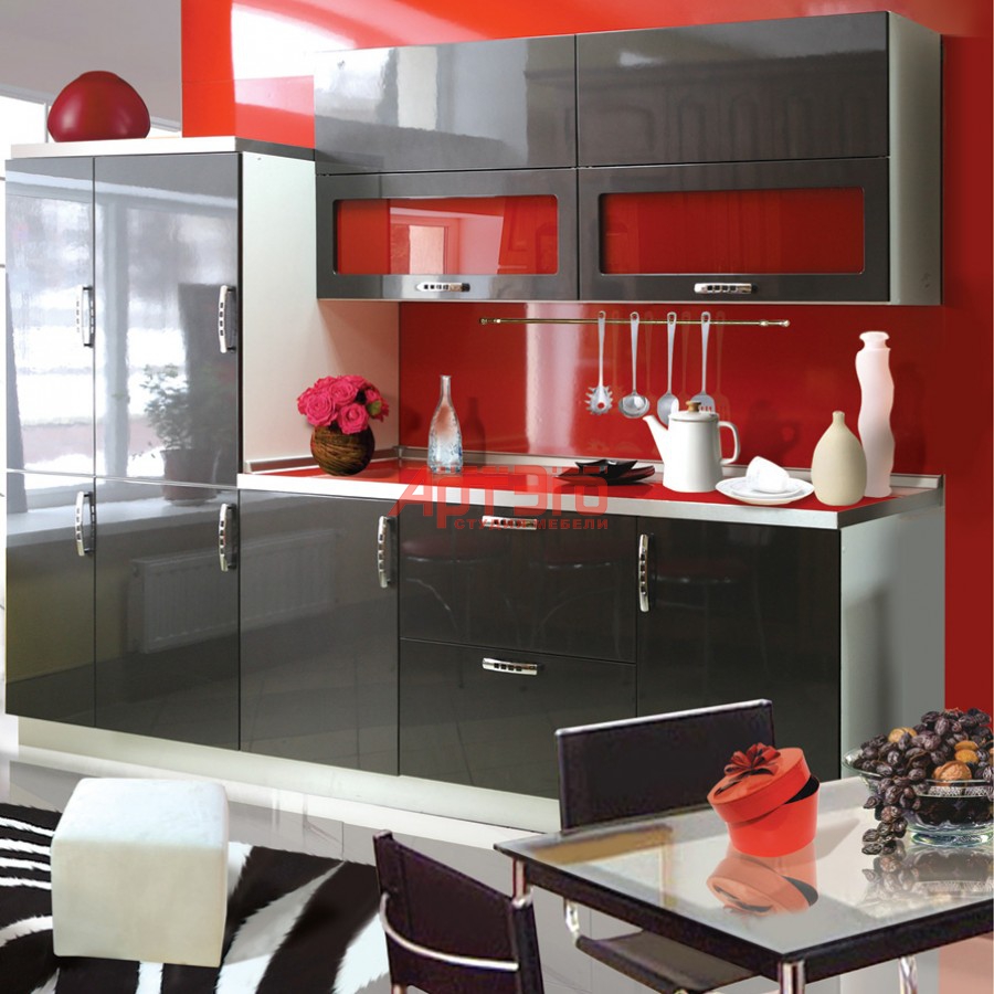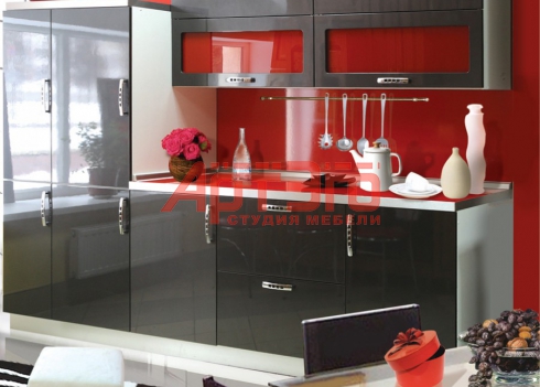 Кухня с фасадом МДФ в пленке ПВХ цвет "Горький шоколад глянец". Модель дополнена вместительным пеналом, имеющим достаточно места для хранения. Верхние шкафы оснащены подъемными механизмами BLUM. Влагостойкая пластиковая столешница в кромке 3D-акрил(REHAU).