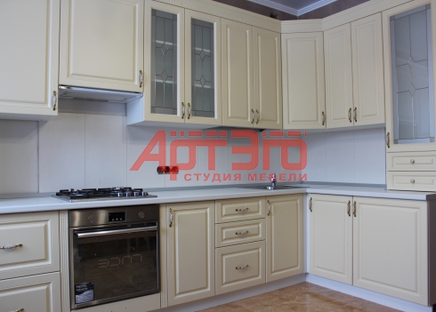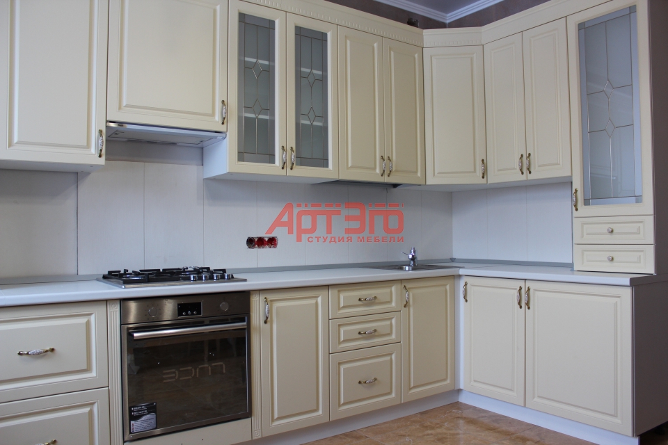 Фасад пленка ПВХ, цвет ваниль. Витражи с бевелем ,протяжка серебро. Ручки керамика бронза. Металлическая фурнитура BOYARD. Столешница белый пластик 38мм СКИФ.